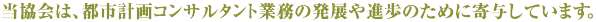 | 当協会は、都市計画技術の向上並びに都市計画コンサルタント業務の健全な発展を図り、都市計画事業の進歩発展に寄与することを目的としております。 | |